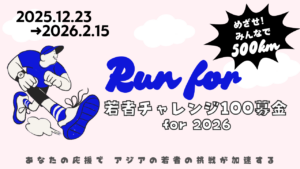 アジアの若者たちの挑戦を応援し、共にアジアの未来を動かしていくためのクラウドファンディング「若者チャレンジ100募金for2026」を前進させるため、期間限定の応援ランを開催します!ランニングでつながり、みんなで合わせて500kmを走ることを目指しながら、アジアの若者たちのチャレンジを応援しま…